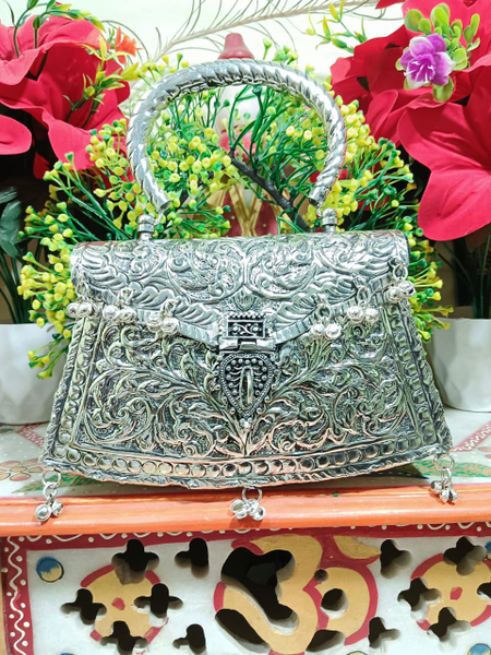 beautiful gift of unique metal clutch purse from the Indian craftsmen. Handmade Vintage Hand Clutch made from Brass Metal . A basic Brass metal object is fist designed and fine carving is done on it by hand. The process is finally completed by oxidization and polishing.The clutch is fixed with Metal Handle and the opening is big enough and the wall of the inner space is also fixed with soft velvet to protect your items.Such metal clutch bags is a very old art and but they are recently been introduced as a fashion statement. Party wear look and this unique bag can Accommodate Any size Cellphone and other small accessories, Design in purpose to give attractive attention in Function,Party Bag Feature:: "Length 7 Inch, Height 6 Inch and Width 2 Inch, Handle Length 4 Inch
