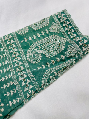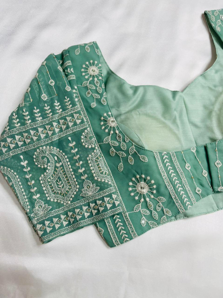 Fabric : Machine Chikankari on georgette base ( Look a like, machine embroidery work) Color : Basil Green Stitching Type : Fully Stitched Work : Sequin Cups Type: Padded Sleeves: Half Sleeves Neckline : V neck Wash care: Dry: Wash Note : Actual product colour may vary due to brightness and camera quality of different devices.
