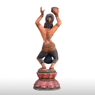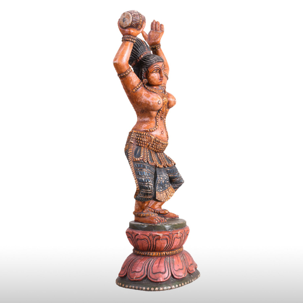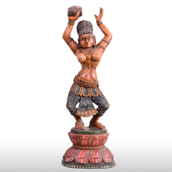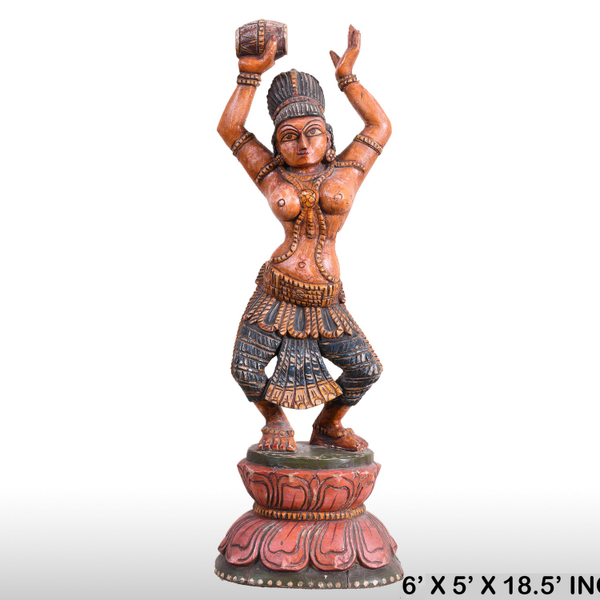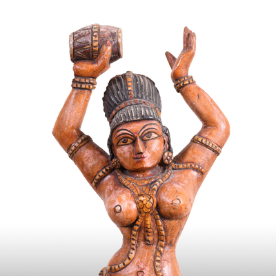 This beautiful lady figure in wood is intended to be used as table décor. It is beautifully carved with a music instrument "DAMRU" in one hand. The wooden statue is carved along with Indian sculpting tradition following the "Tribhanga pose". It gives grace and style to the figurine. It is painted beautifully by our artists.