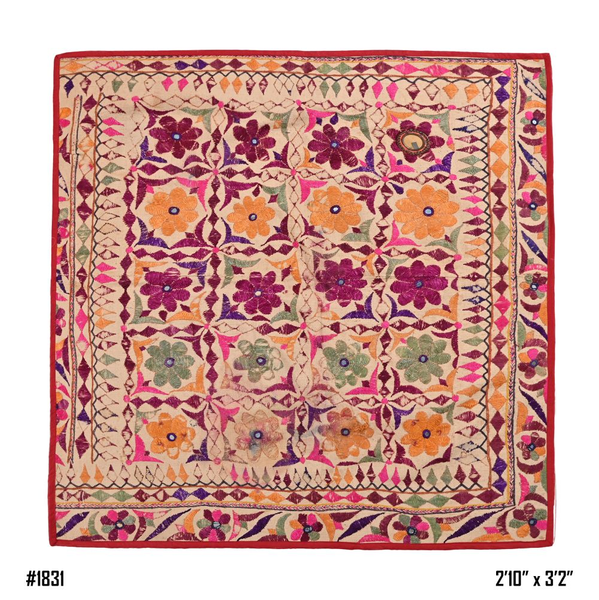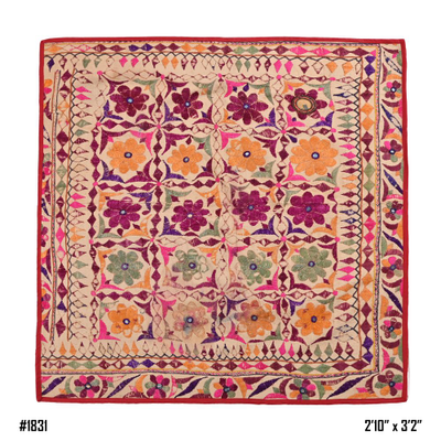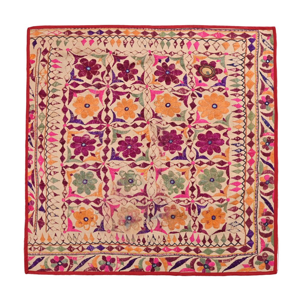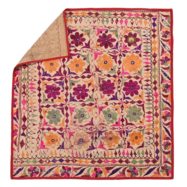 These magnificent embroideries, preserved from the 1930s come from the Kutch region of Gujarat in India. Historically, it is said that Kutch embroidery was brought about by 'Kathi cattle breeders who were brought by the mythological figure 'karma' from Mahabharata. Eventually, these wanderers settled down and produced some fine needlework. The art form became a vocation for women of Kutch which became a generational art with the skills taught from mother to daughter.  The signature effect of the colorful embroidery sparkles when small mirrors called able are sewn over the designs. A lot of the Kutch embroidery is influenced by various architectural designs and motifs. The embroidered cloths are used for festive occasions and to decorate deities, therefore animals and figures of Indian Gods and Goddesses find a prominent place in the design.
