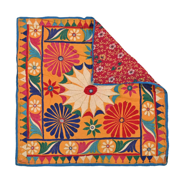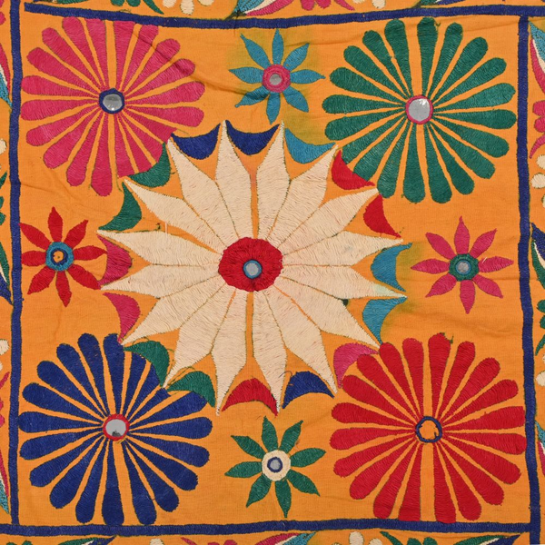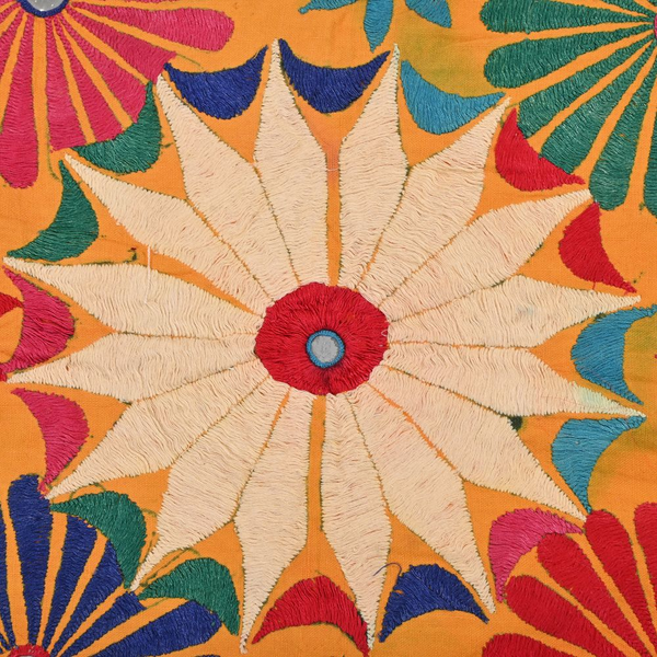 These magnificent embroideries, preserved from the 1930s come from the Kutch region of Gujarat in India. Historically, it is said that Kutch embroidery was brought about by 'Kathi cattle breeders who were brought by the mythological figure 'karma' from Mahabharata. Eventually, these wanderers settled down and produced some fine needlework. The art form became a vocation for women of Kutch which became a generational art with the skills taught from mother to daughter. The signature effect of the colorful embroidery sparkles when small mirrors called able are sewn over the designs. A lot of the Kutch embroidery is influenced by various architectural designs and motifs. The embroidered cloths are used for festive occasions and to decorate deities, therefore animals and figures of Indian Gods and Goddesses find a prominent place in the design.