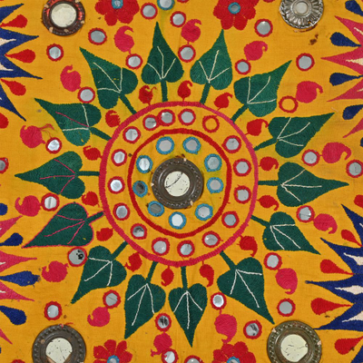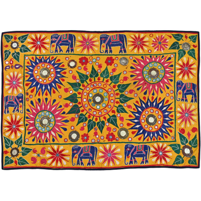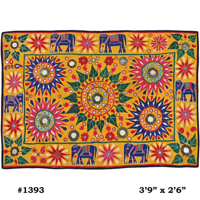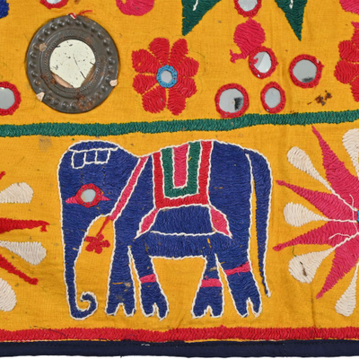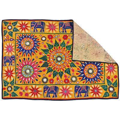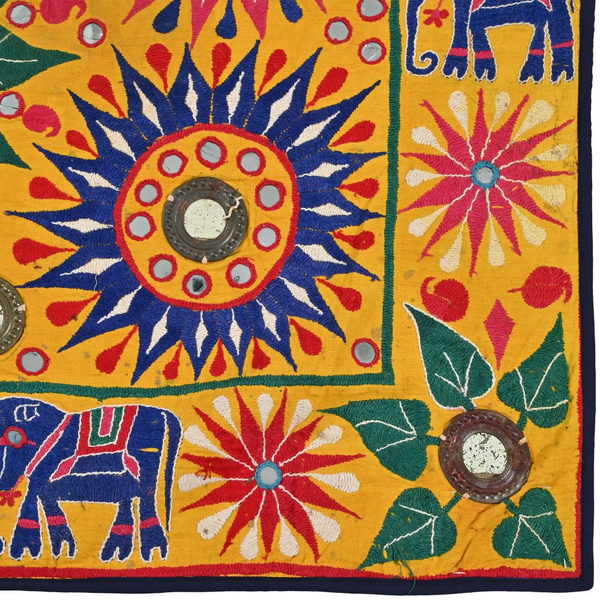 These magnificent embroideries, preserved from the 1930s come from the Kutch region of Gujarat in India. Historically, it is said that Kutch embroidery was brought about by 'Kathi cattle breeders who were brought by the mythological figure 'karma' from Mahabharata. Eventually, these wanderers settled down and produced some fine needlework. The art form became a vocation for women of Kutch which became a generational art with the skills taught from mother to daughter. The signature effect of the colorful embroidery sparkles when small mirrors called abhle are sewn over the designs. A lot of the Kutch embroidery is influenced by various architectural designs and motifs. The embroidered cloths are used for festive occasions and to decorate deities, therefore animals and figures of Indian Gods and Goddesses find a prominent place in the design.