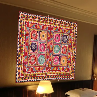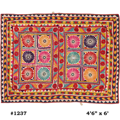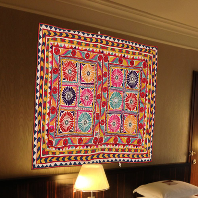 4.6*6 Feet Vintage Wall Hanging Gujrati Textile, Living Room Cotton Tapestry, Antique Indian Home Decor Furnit...