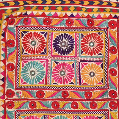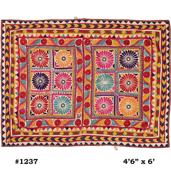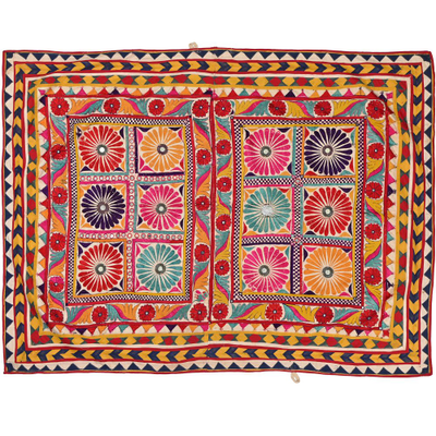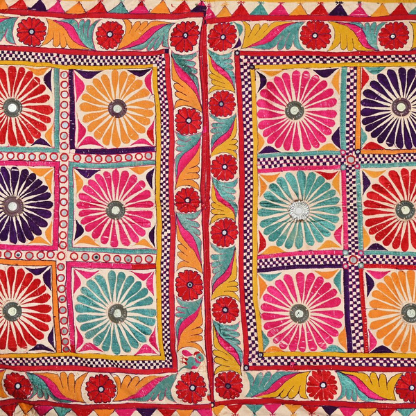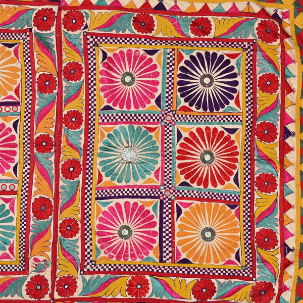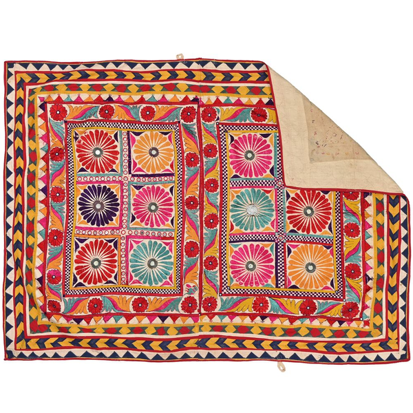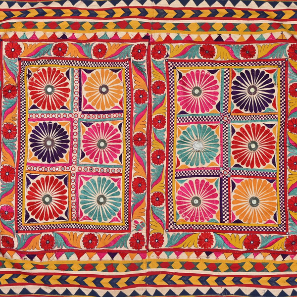 These magnificent embroideries, preserved from the 1930s come from the Kutch region of Gujarat in India. Historically, it is said that Kutch embroidery was brought about by 'Kathi cattle breeders who were brought by the mythological figure 'karma' from Mahabharata. Eventually, these wanderers settled down and produced some fine needlework. The art form became a vocation for women of Kutch which became a generational art with the skills taught from mother to daughter. The signature effect of the colorful embroidery sparkles when small mirrors called able are sewn over the designs. A lot of the Kutch embroidery is influenced by various architectural designs and motifs. The embroidered cloths are used for festive occasions and to decorate deities, therefore animals and figures of Indian Gods and Goddesses find a prominent place in the design.