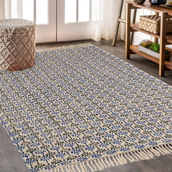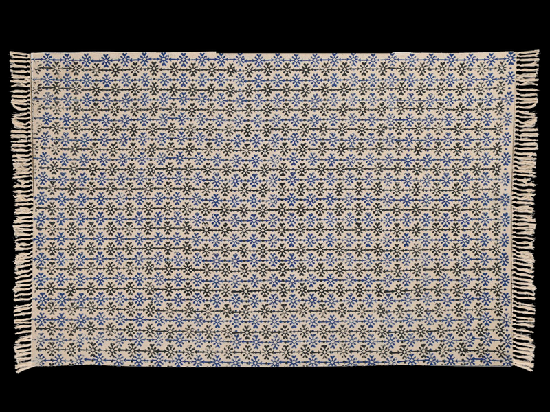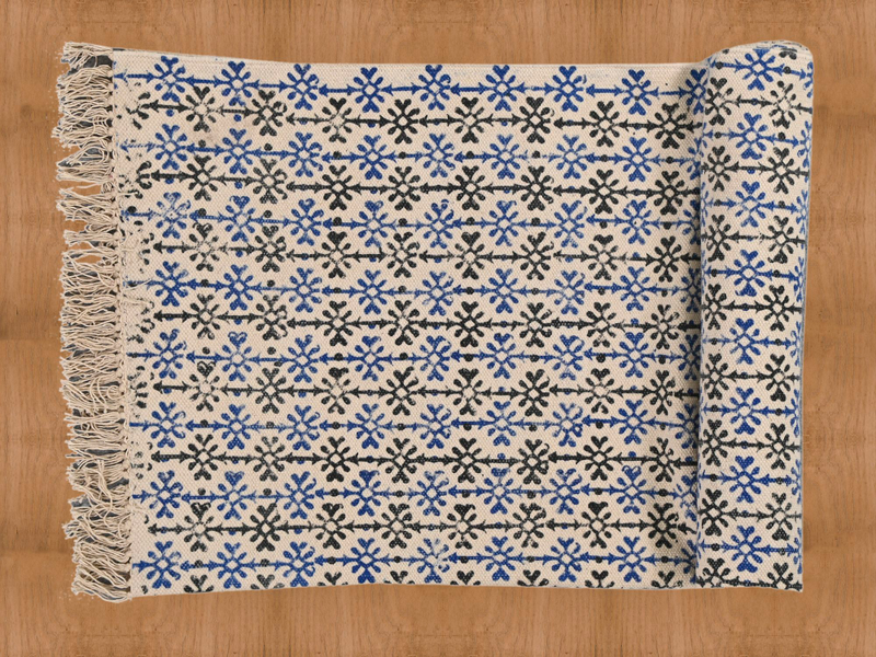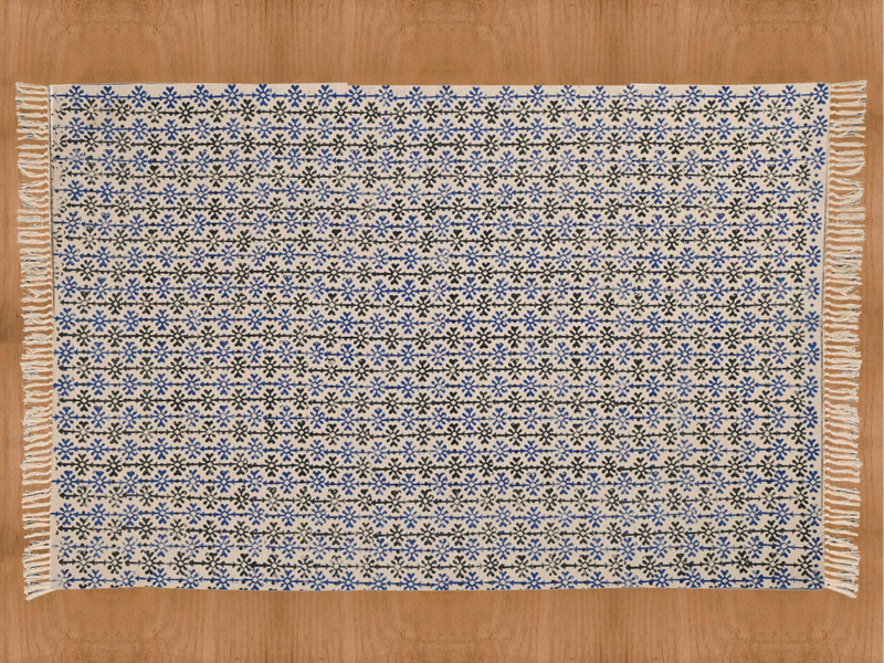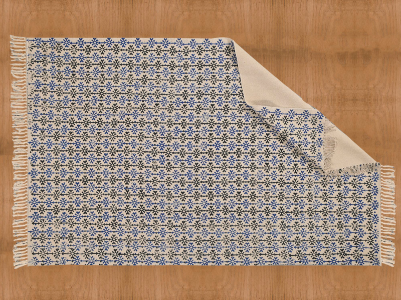 Making - Our rugs are made from locally sourced sustainable materials. We use 100% cotton yarn as the primary raw material to hand weaves the rugs. The yarn is also hand spun by our weavers. This hand loomed rug is an amalgamation of simple yet effective hand blocks designs.