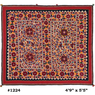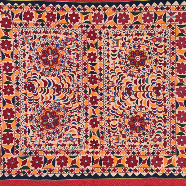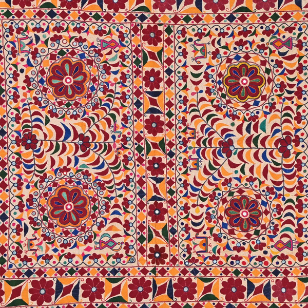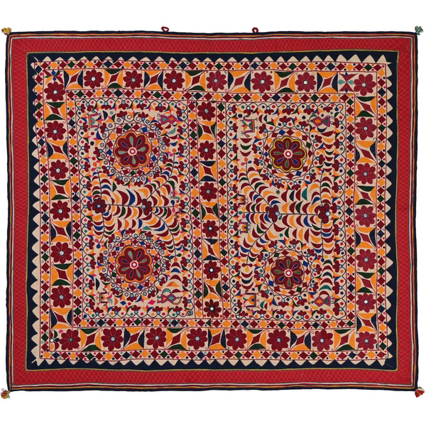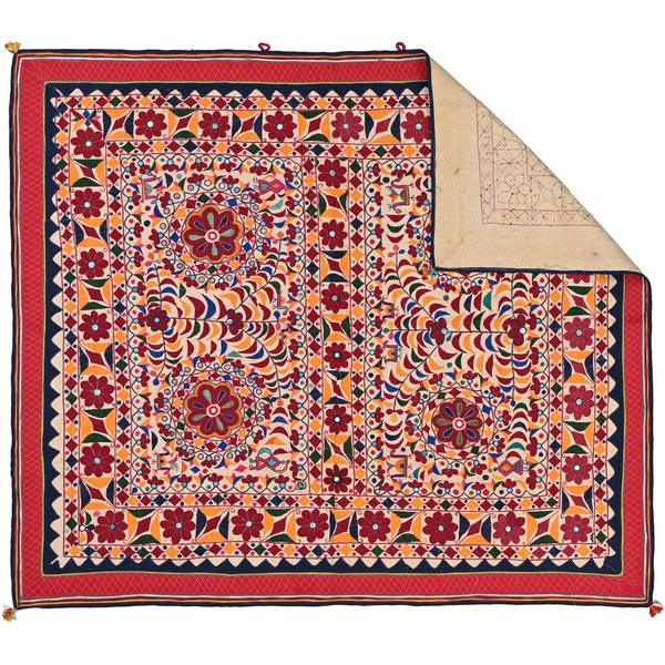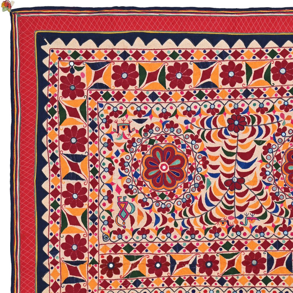 These magnificent embroideries, preserved from the 1930s come from the Kutch region of Gujarat in India. Historically, it is said that Kutch embroidery was brought about by 'Kathi cattle breeders who were brought by the mythological figure 'karma' from Mahabharata. Eventually, these wanderers settled down and produced some fine needlework. The art form became a vocation for women of Kutch which became a generational art with the skills taught from mother to daughter.  The signature effect of the colorful embroidery sparkles when small mirrors called able are sewn over the designs. A lot of the Kutch embroidery is influenced by various architectural designs and motifs. The embroidered cloths are used for festive occasions and to decorate deities, therefore animals and figures of Indian Gods and Goddesses find a prominent place in the design.