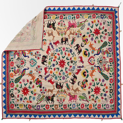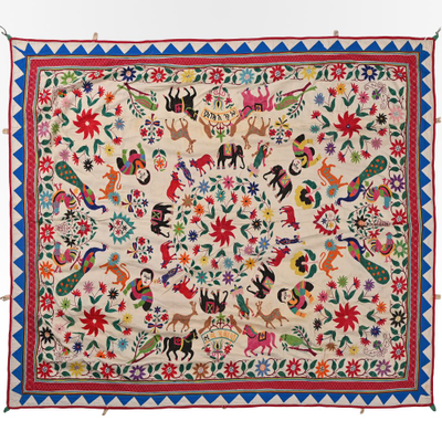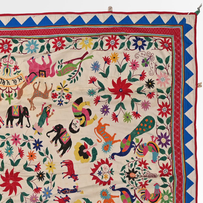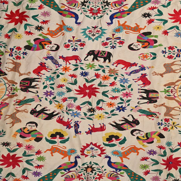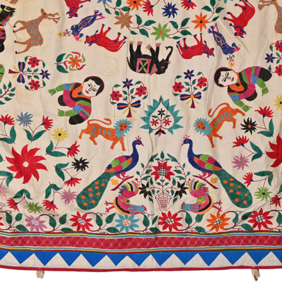 These magnificent embroideries, preserved from the 1930s come from the Kutch region of Gujarat in India. Historically, it is said that Kutch embroidery was brought about by 'Kathi cattle breeders who were brought by the mythological figure 'karma' from Mahabharata. Eventually, these wanderers settled down and produced some fine needlework. The art form became a vocation for women of Kutch which became a generational art with the skills taught from mother to daughter. The signature effect of the colorful embroidery sparkles when small mirrors called abhle are sewn over the designs. A lot of the Kutch embroidery is influenced by various architectural designs and motifs. The embroidered cloths are used for festive occasions and to decorate deities, therefore animals and figures of Indian Gods and Goddesses find a prominent place in the design.