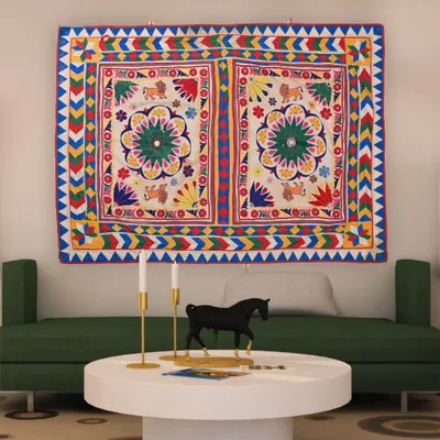 6*4.3 Feet Indian Hand Embroidered Wall Hanging Gujrati Textile, Vintage Cotton Tapestry, Boho Banjara Textile...