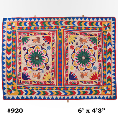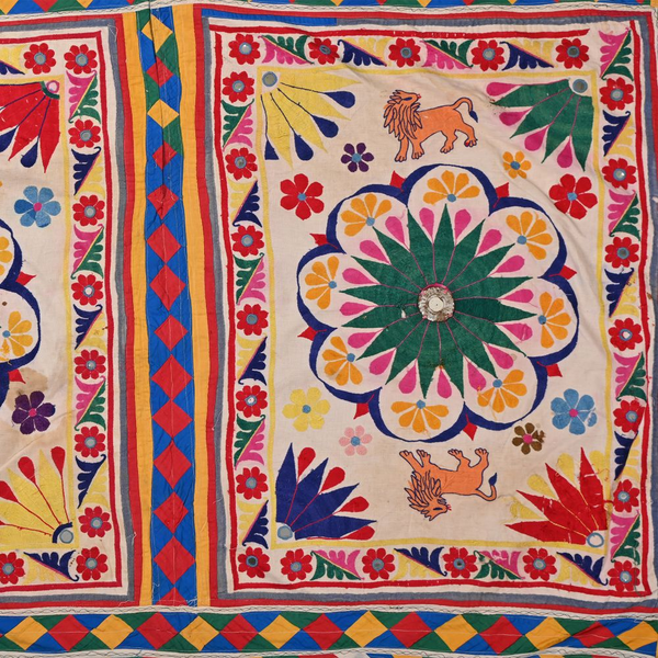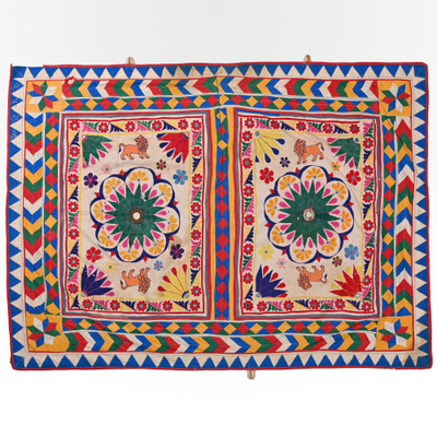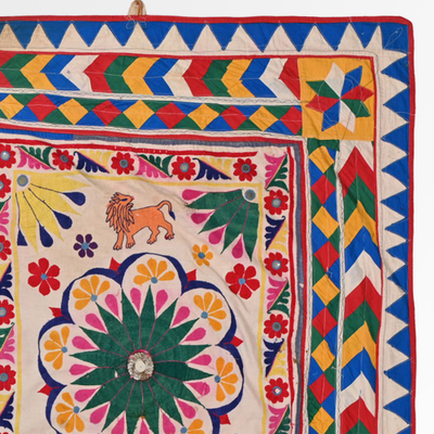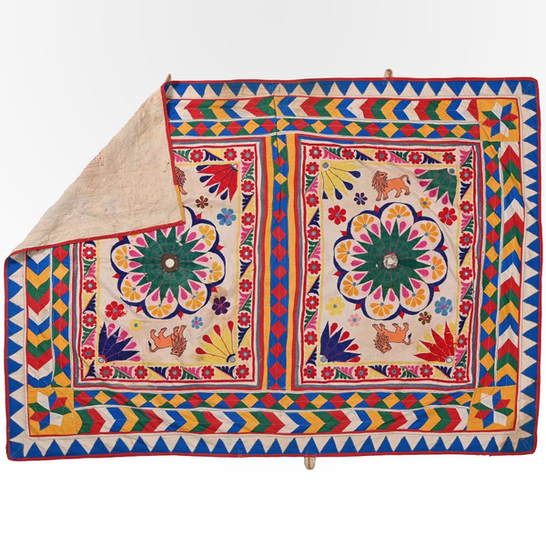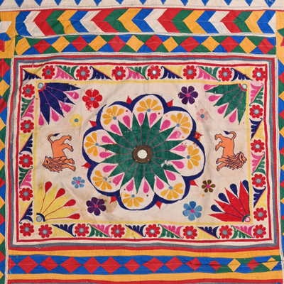 These magnificent embroideries, preserved from the 1930s come from the Kutch region of Gujarat in India. Historically, it is said that Kutch embroidery was brought about by 'Kathi cattle breeders who were brought by the mythological figure 'karma' from Mahabharata. Eventually, these wanderers settled down and produced some fine needlework. The art form became a vocation for women of Kutch which became a generational art with the skills taught from mother to daughter. The signature effect of the colorful embroidery sparkles when small mirrors called abhle are sewn over the designs. A lot of the Kutch embroidery is influenced by various architectural designs and motifs. The embroidered cloths are used for festive occasions and to decorate deities, therefore animals and figures of Indian Gods and Goddesses find a prominent place in the design.