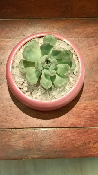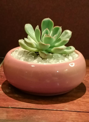 A succulent with rosette arrangement of leaves placed in a shiny pink porcelain bowl of 6" dia and 2.5 inches height.It ornamented with crystal white chips.