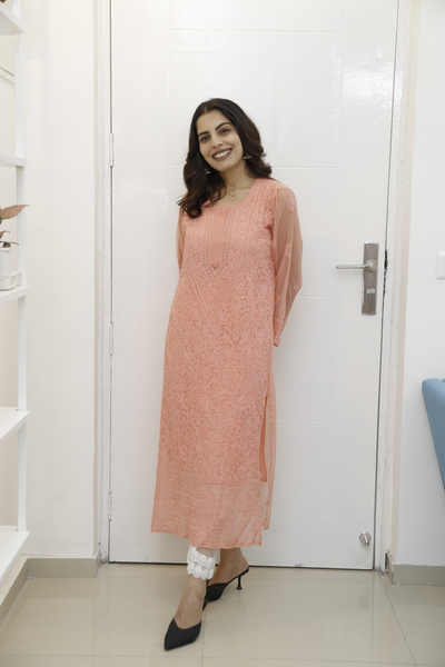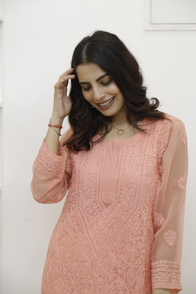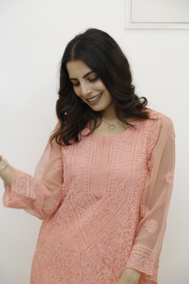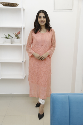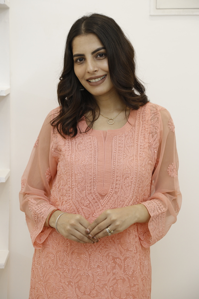 Exquisite hand embroidered chikankari with resham threads of same colour is an aesthetic addition to your wardrobe. Crafted from delicate fabrics, this kurti features an elegant design with rich and fine embroidery patterns all over the kurti and small flowery patterns on sleeves and back. Includes- Kurti with cotton inner. Length- 44-46 inches. Wash and care- Hand wash separately in cold water.