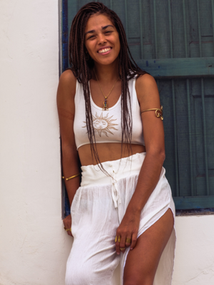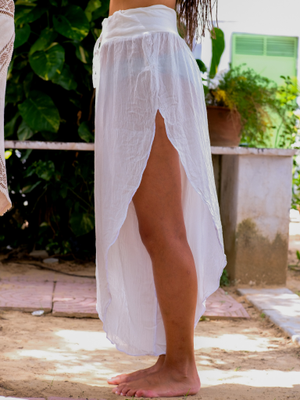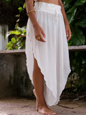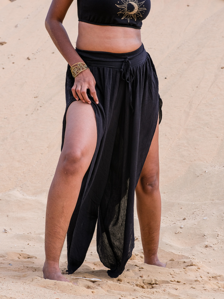 Elevate your style with our Abria Pants, a captivating blend of comfort and boho goddess allure. Crafted from luxurious viscose and cotton lyra fabrics, these pants offer a breezy and soft feel. Available in timeless white and classic black, the free size design accommodates waist sizes 26 to 32, with an adjustable drawstring ensuring a personalized fit. Exuding an enchanting aura, these pants feature stylish splits on both sides, harmonizing boho charm with modern chic. Embrace the essence of a goddess as you embody elegance and grace in every step.