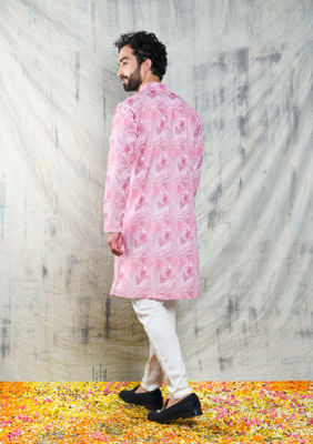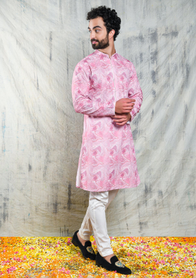 ABSTRACT PINK EMBROIDERED KURTA SET WITH CONTRAST NECK PIPING DETAIL