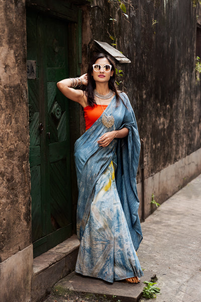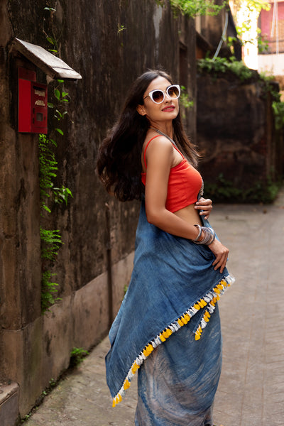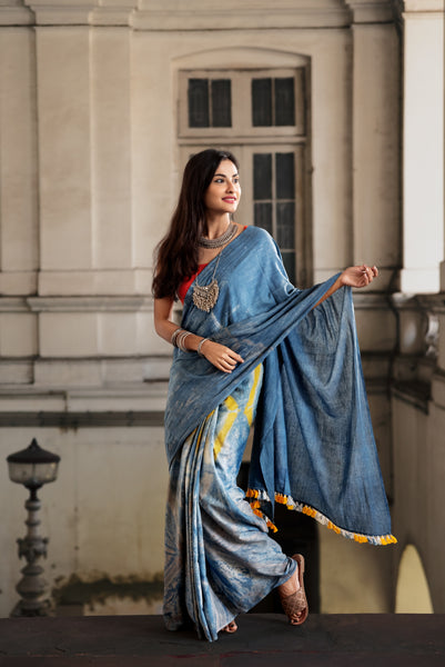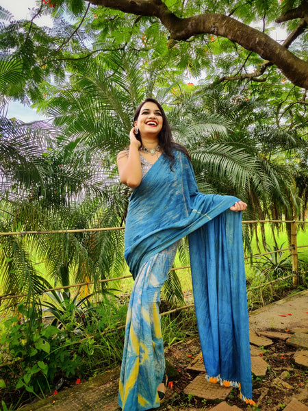 This indigo and turmeric dyed handloom cotton saree is sure to make you fall in love with its beauty!
