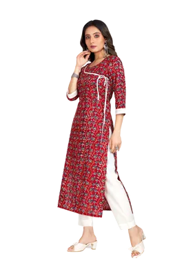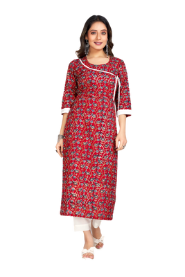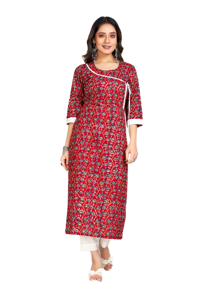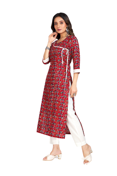 A Cool Combination of Comfort and Class - Angrakha Style Bagru Kurta Set. Kurta Features round neck, 3/4thStraight Sleeves and Side Slits.