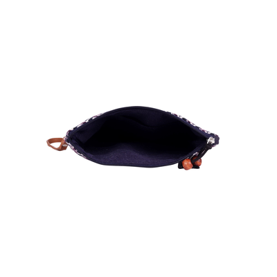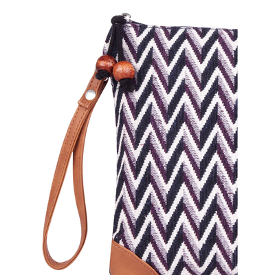 Beautiful Cotton Pouch With PU material side corners, PU clutch handle for easy handling, top zipper with fancy wooden bead puller, inside polyester lining with zipper closure.