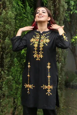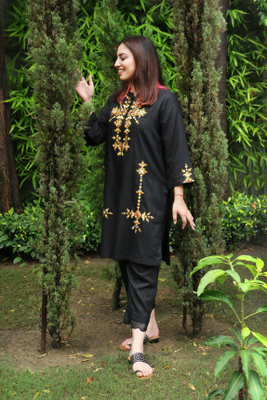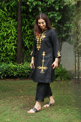 Mahi silk suit with aztec embroidery . Scalloping with organza on the pants . Part of our collection Gaia.