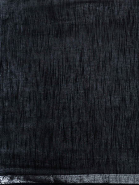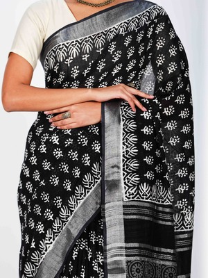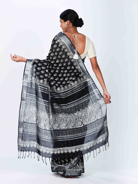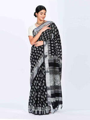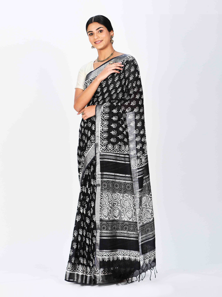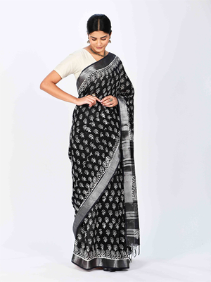 Black linen saree with all over print and zari border. This saree has an all over abstract floral print on the body and pallu with floral patterns in zari work with tasseled border.