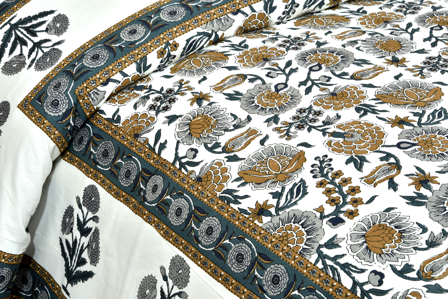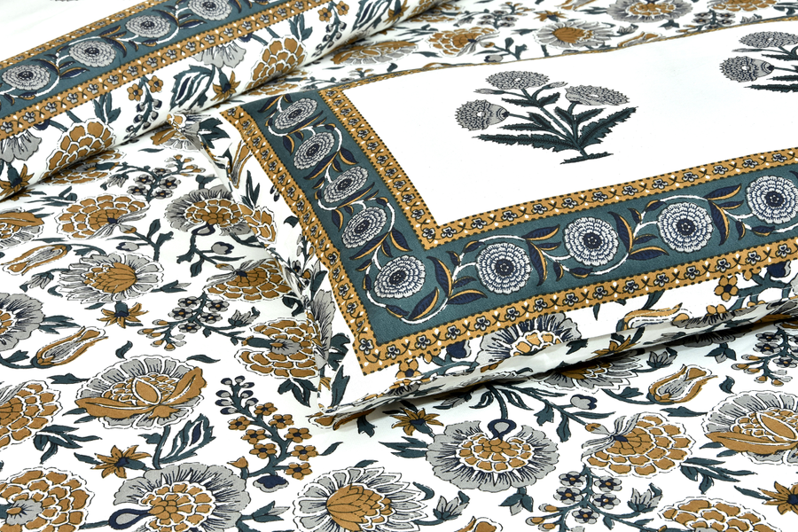 Introducing the Blossom collection from Urban Jaipur - a stunning range of premium bed sheets that are perfect for adding a touch of elegance and sophistication to your bedroom decor. Crafted from pure cotton with a thread count of 200, these bedsheets are incredibly soft and comfortable, ensuring a peaceful night's sleep. Measuring 95 x 108 inches, they come in queen size and feature a beautiful green and mustard marigold floral print that is sure to catch the eye. The set includes two pillow covers that complement the bedsheets perfectly. Hand screen printed using fast colors, these bedsheets are of exceptional quality and are sure to stand the test of time. Made in Jaipur, these bedsheets are a true reflection of the city's rich artistic heritage and attention to detail. Upgrade your bedding with the Blossom collection and experience the ultimate in comfort and style.