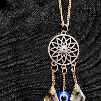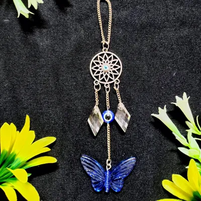 "A attracting hanger featuring an evileye design, complemented by a mesmerizing mandala charm and a lovely butterfly motif."