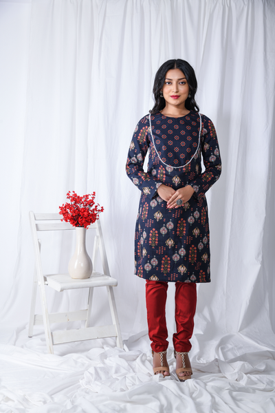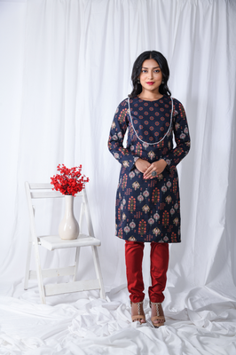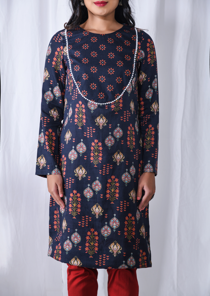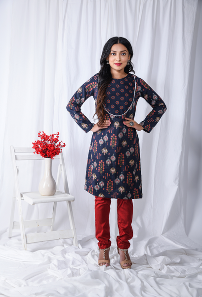 Introducing our stunning Blue Printed Floral Yoke Kurta, a must-have addition to your ethnic wardrobe. This exquisite kurta features a captivating floral print in shades of blue, exuding elegance and charm. This is a printed cotton satin long sleeves kurta set with semi oval neck yoke which has pearl lace on the border of the yoke. This floral printed kurta is an Indian esthetics dream. Style it up with a sharara or a skirt or a plain pants Perfect for both casual and festive occasions. Step into the world of fashion with this chic and fashionable floral yoke kurta. Shop now and embrace the perfect blend of style and grace.