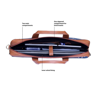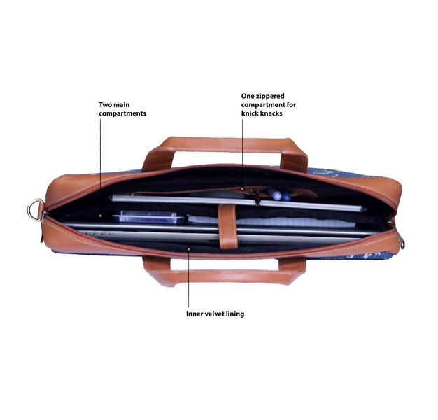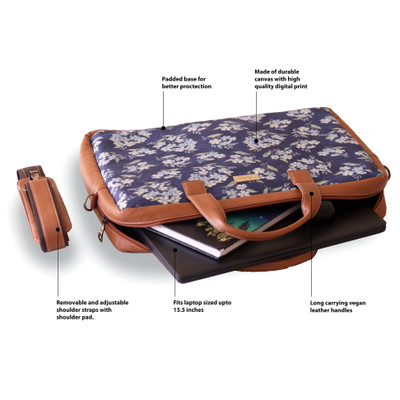 An original Strokes design with a chic botanical motif, this laptop bag is durable with vegan leather handles and base, spacious with 2 main compartments and 1 zipped pocket inside, and can fit up to a 16.4 inch laptop. The removable and adjustable long shoulder strap add convenience and make it easy to carry your laptop on a long day of work!