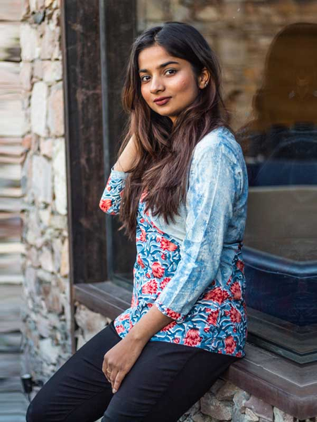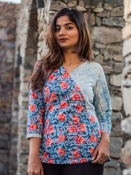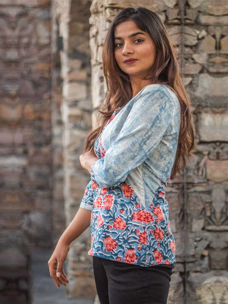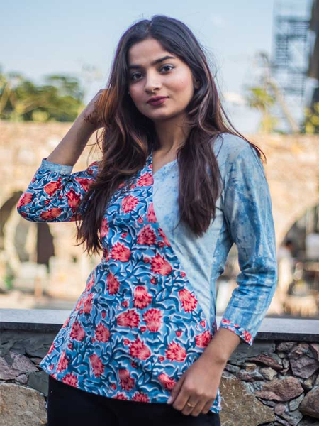Blue Half-Half Printed Top, Can Be Worn By Any Body Type