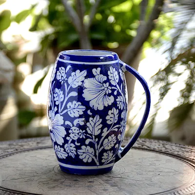 Blue Pottery Handmade BLUE & WHITE FLORAL BEER MUG is beautiful and elegant made with love. Unique in design and handcrafted with love.Blue Pottery Products are Perfect for your home decor.If you want to add a dose of style & class to your bar, these Blue pottery beer mugs are meant for you. Handmade by the artisans from Jaipur, Rajasthan, the mugs can be used for other beverage purposes too. It is a perfect gifting idea for your beer-loving friends.Features :Eco FriendlyHandcraftedOrganicBlue Pottery is widely recognized as a traditional craft of Jaipur, though it is Turko-Persian in origin. The name ‘blue pottery’ comes from the eye-catching Cobalt blue dye used to color the pottery. It is one of many Eurasian types of  blue and white pottery, and related in the shapes and decoration to Islamic Pottery and, more distantly, chines pottery. It is relatively unusual as a type of quality or luxury Indian Pottery, most Indian types being functional and though often highly decorated, relatively low prestige wares.Blue Jaipur is all about showing this world the blue shades of pottery. At Blue Jaipur, we believe in art and artists its beauty and appreciation. If you want to add a dose of style & class to your bar, these Blue pottery beer mugs are meant for you. Handmade by the artisans from Jaipur, Rajasthan, the mugs can be used for other beverage purposes too. It is a perfect gifting idea for your beer-loving friends.Features :Eco FriendlyHandcraftedOrganicSize – 6 Inch