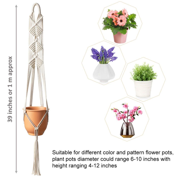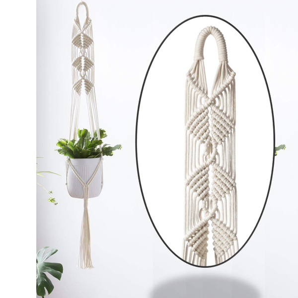 Handmade of natural, high quality cotton (made from plants) and designed to exceed your highest expectations! Truly beautiful timeless bohemian style with great accent matches with any modern or conventional style. Sleek plant hanger and matches perfectly with neutral pots and pottery. With a natural cotton fiber abundant in nature comes an elegant look and shine and this rope planter holder does not contain any artificial ingredients or chemicals. Perfect boho décor hanging element and will keep your pets away from your plants.