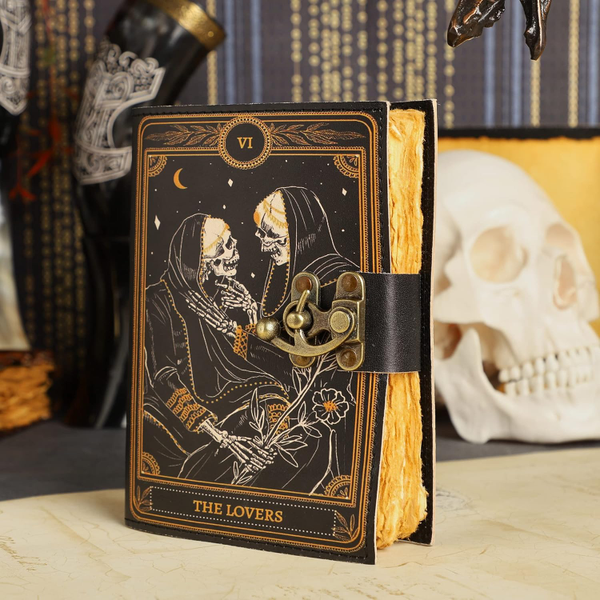 • MANY USES - This aesthetic Lovers Journal Can be used as a Hocus Pocus gifts , the lovers tarot journal, gothic notebook, skull journal, spell books halloween decorations, book of spells halloween decor. grimoire spell book, drawing or sketching and compact for carrying in your bag. Ideal for alternative Artist Sketchbooks, Photo Album, Traveling Notes, Business Executive, Logbook, hocus pocus spell book , Journalists, Food Planner, old spell notebook, antique handmade skull journal