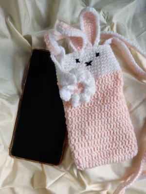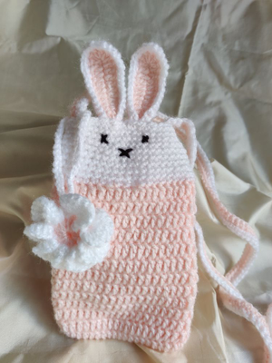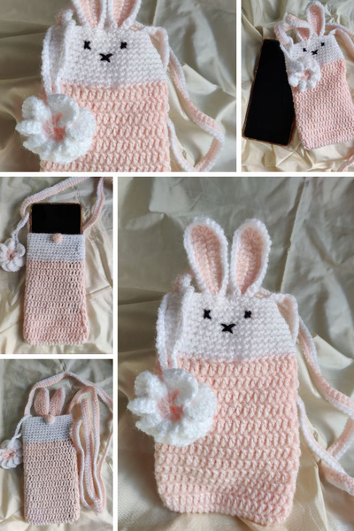 Bunny Crochet Peach and White Sling Mobile Phone Bag with crochet flower charm, Handmade, Eco friendly,