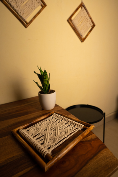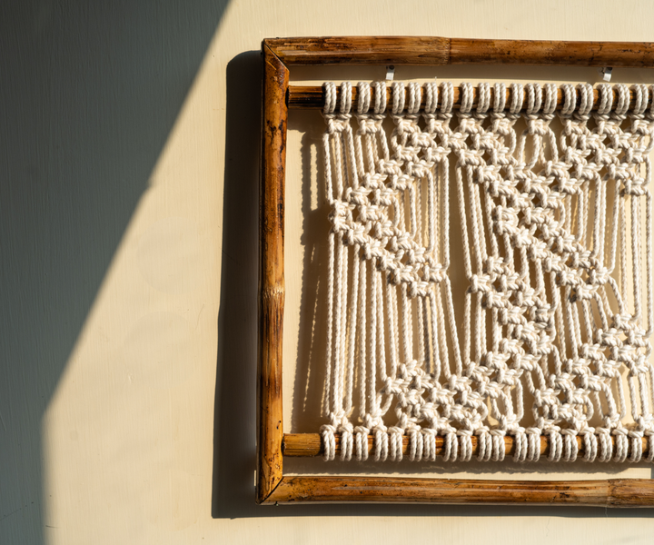 Indulge in the perfect blend of texture and artistry with our canvas featuring a stunning combination of macramé and cane accents. This unique piece brings a touch of bohemian elegance to your walls, creating a captivating focal point that seamlessly blends natural elements and creative craftsmanship. Elevate your space with this enchanting work of art.