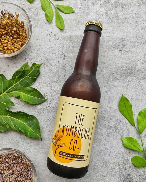 This is an aromatic & bubbly Kombucha with mild floral notes from Chamomile-Lavender flowers. Handmade brews made in small batches, with organic Assam tea.
