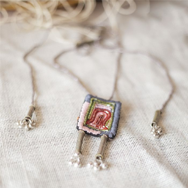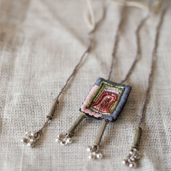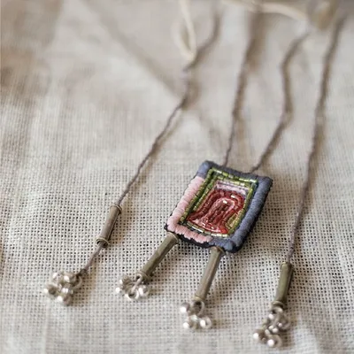 The product is made using grey fabric and cotton embroidery threads. It is embellished using katdana, tubes, and ghungroos. The product depicts the story of the traditional tribe of Lambanis. Material Used Grey fabric, Silver tubes, Katdana, Ghungroos and cotton embroidery threads MADE IN INDIA