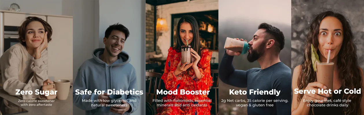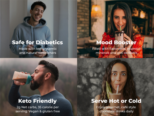 With just 2 g net carbs per serving, it is completely Sugar Free, Keto friendly, Vegan, Gluten Free, Low GI and full of essential minerals, anti oxidants and mood boosting flavonoids. Perfectly sweetened with premium, natural, zero calorie sugars that are expertly blended to ensure no aftertaste.