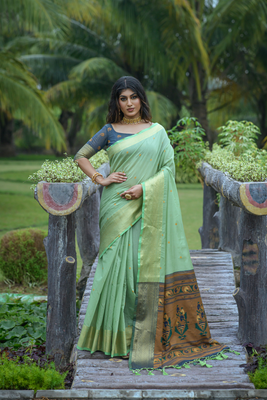 Sea Green Linen Cotton Zari Woven Saree with Blouse Piece (ALOKA)