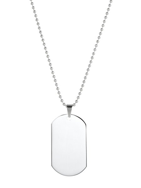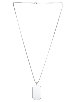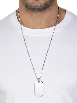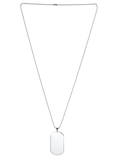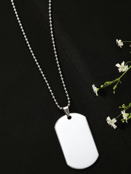 This silver metallic pendant necklace will give you a cool dude look. This Pendant necklace has a ball chain and a dogtag pendant.