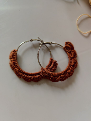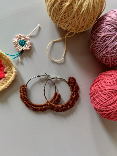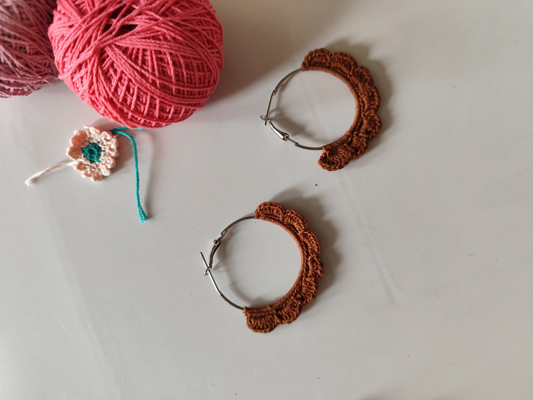 This earrings are handmade and are so cute and minimal. It's made out of cotton thread and plus it's made on stainless steel hoops. It has small design in down sides and it's customized too you can just wear it on college, office and it's even good on traditional wears too.
