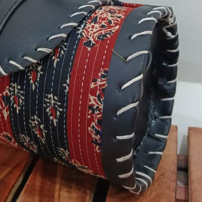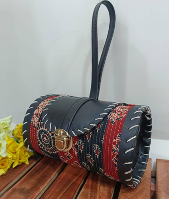 Introducing our adorable Cute Round Cylindrical Sling Bag, a perfect fusion of style and charm. Crafted with exquisite Mashru and Kantha work material, this bag showcases the beauty of traditional artistry.