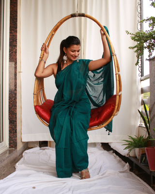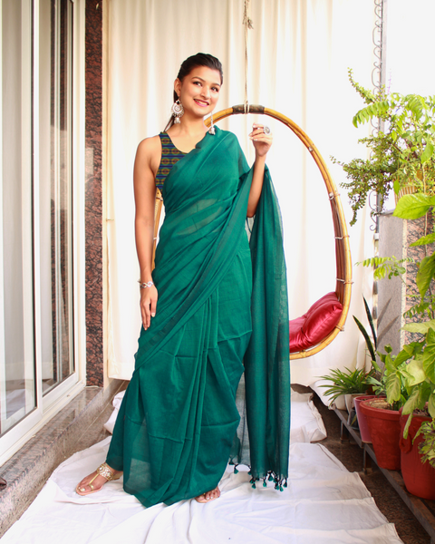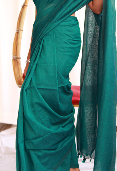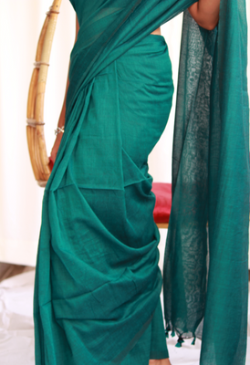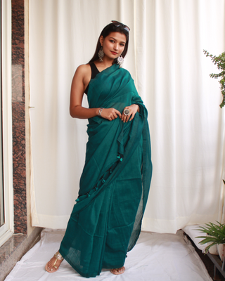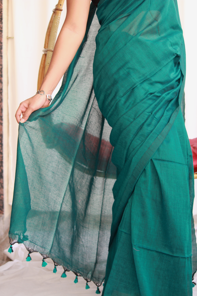 Solid colour- Deep Bluish Green Saree with tassels.