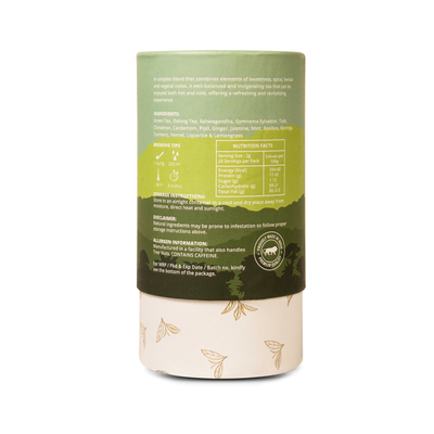 - Ingredients - Oolong & Green Tea, Rooibos, Tulsi, Cinnamon, Licorice, Pipli, Ginger, Jasmine, Moringa, Gymnema Sylvester, Turmeric, Fennel, Mint, Ashwgandha, Cardamom and Lemongrass.