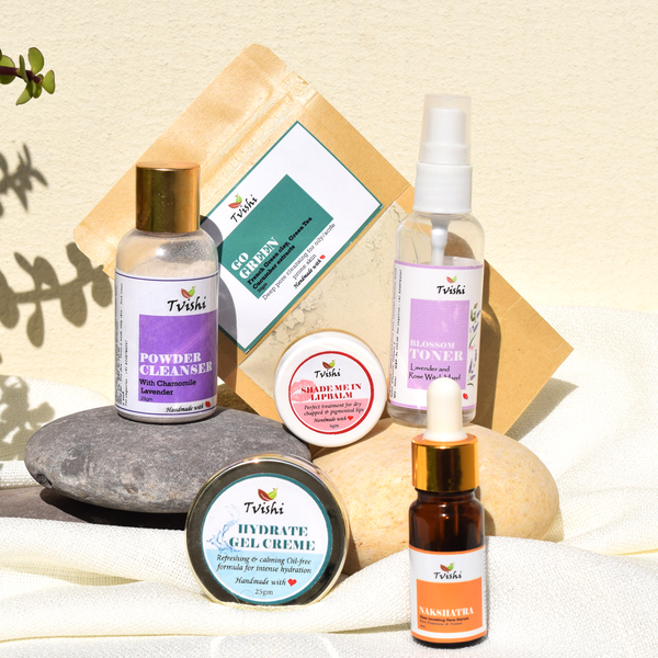 This Kit Includes 1. Powder Cleanser 25gm 2. Blossom Toner 60ml 3. Hydrate Gel crème 25gm 4. Nakshatra Glow Serum 10ml 5. Go Green Clay Mask 50gm 6. Shade me in lipbalm