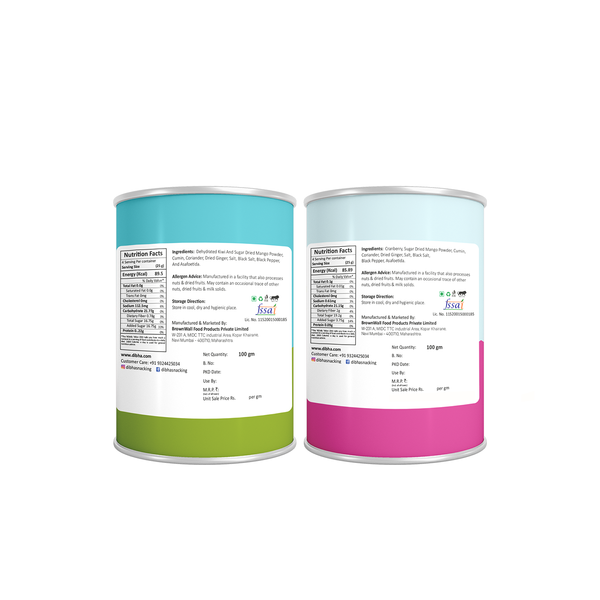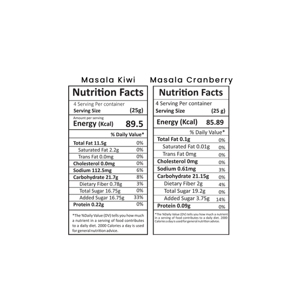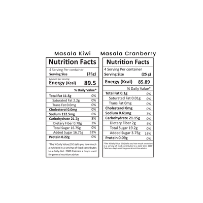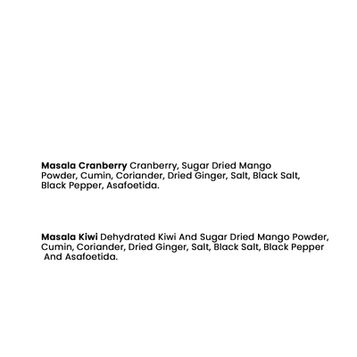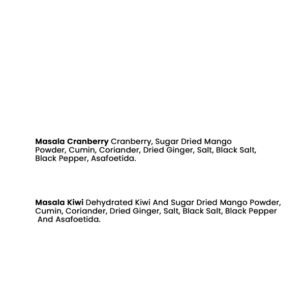 - Ingredients - Masala Cranberry - Dried Cranberry, Flavouring Powder & Salt Masala Kiwi - Dried Kiwi, Flavouring powder & salt