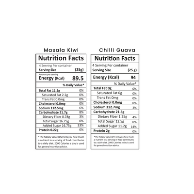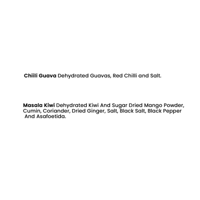 - Ingredients - Masala Kiwi - Dried Kiwi, Flavouring powder & salt Chilli Guava - Dried Guava Slices & Flavouring powder & salt