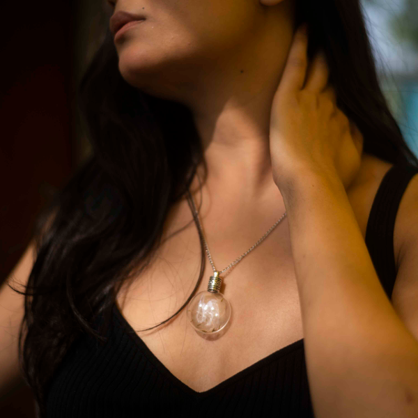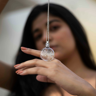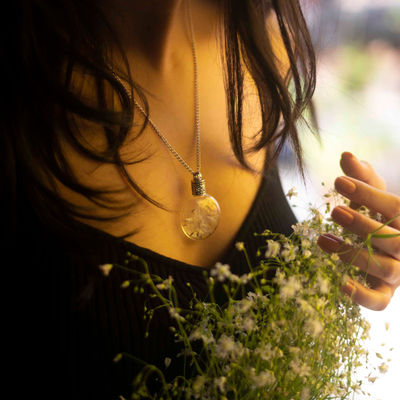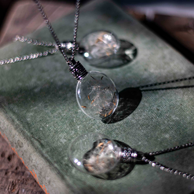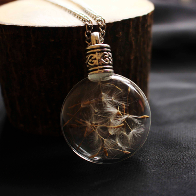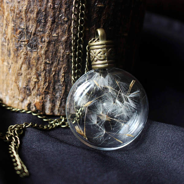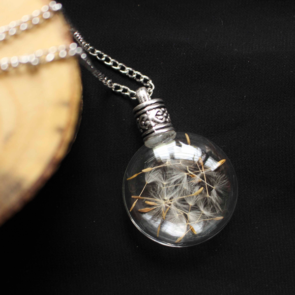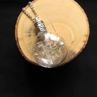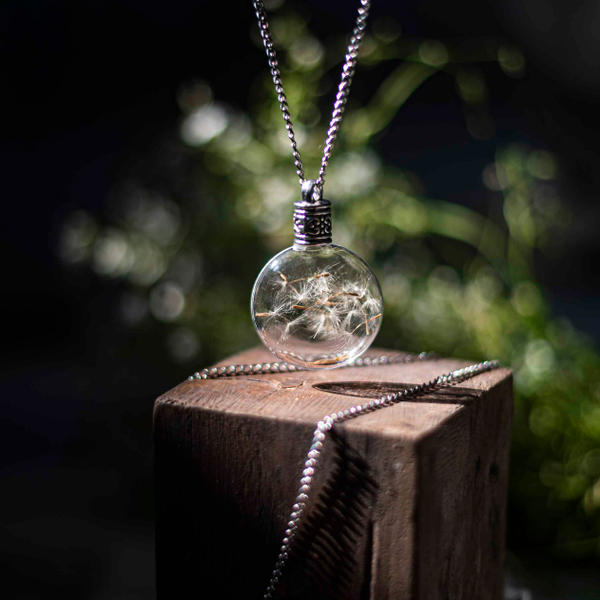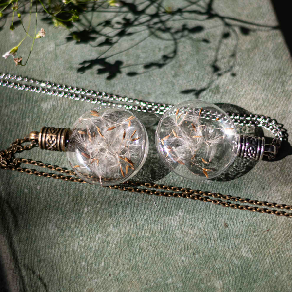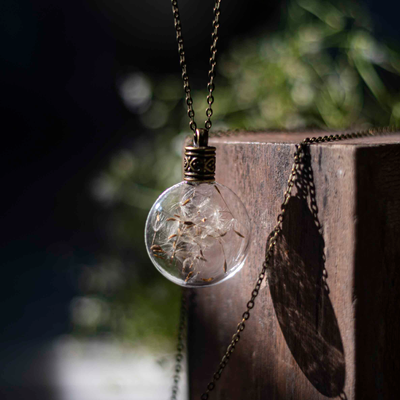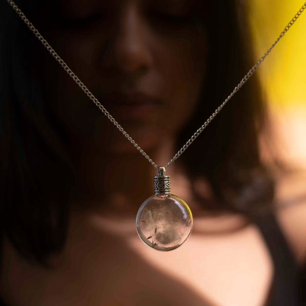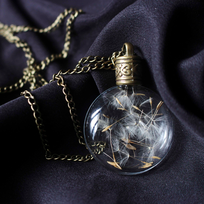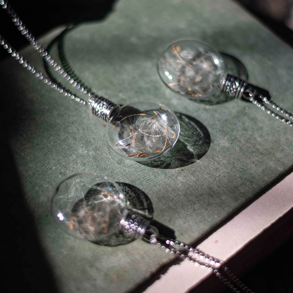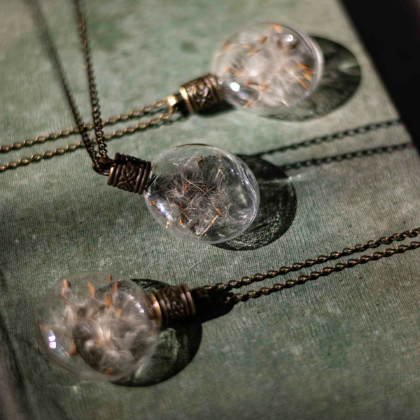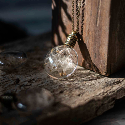 This enchanted piece of jewelry encases handpicked Dandelion seeds, sealed in a lovely, round glass bottle with an elegant metal screw.