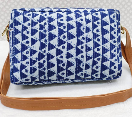 Ethnic Printed Fabric Radio Sling Bag with Leatherette Strap - Blue