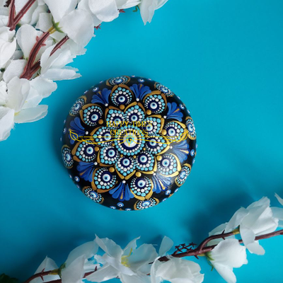 Hand painted intricate dot mandala pattern on stone that is 4 inches diameter and height of 1.18 inches.