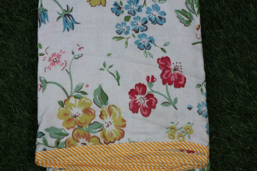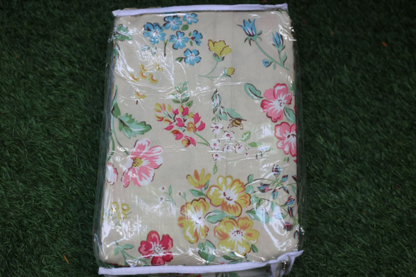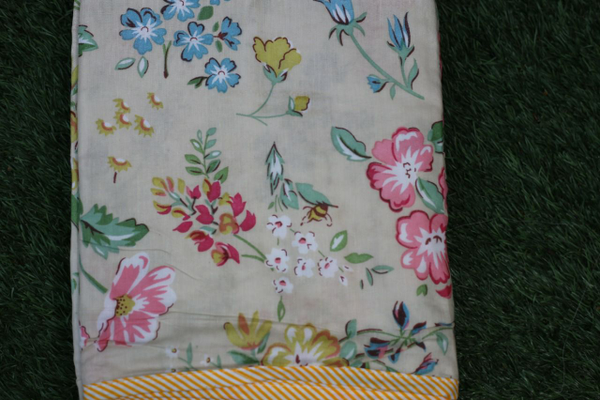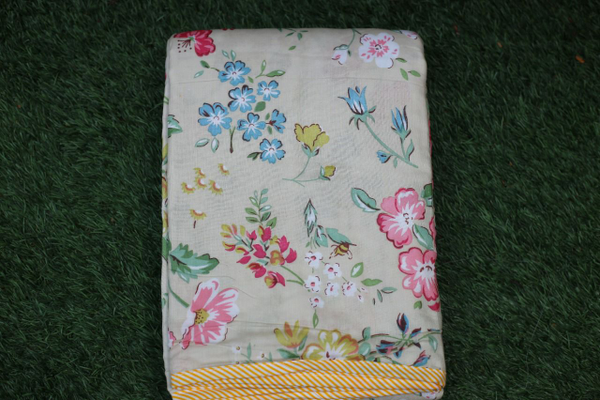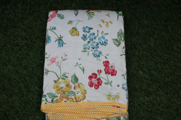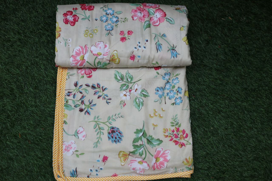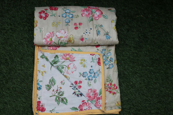Product Description: The beautiful floral block scattered all over on beige background with striped piping running at the edges gives a graceful look to the blanket. A layer of finest and softest flannel is put in between to provide warmth and comfort. The other side in white with colourful flowers all over complements beautifully.