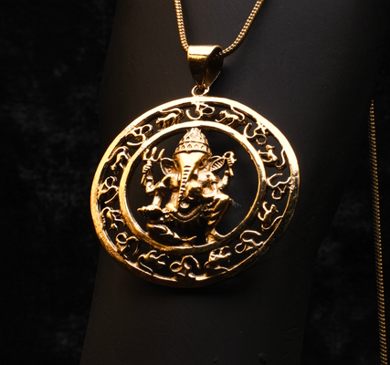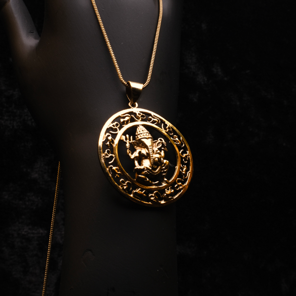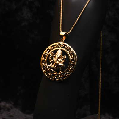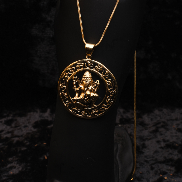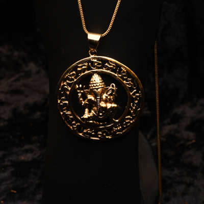 Embrace the divine energy with the Ganapathi Necklace, a sacred piece that honors Lord Ganesha's blessings. The necklace features a 2-inch brass pendant intricately crafted in the likeness of the revered elephant-headed deity. Suspended on an 18-inch chain, it rests gracefully on the wearer, symbolizing wisdom, prosperity, and new beginnings. The warm brass hue adds a touch of elegance to the necklace, making it a cherished accessory for both spiritual and everyday wear. Invite the auspicious presence of Lord Ganesha into your life with the captivating Ganapathi Necklace, a token of divine protection and guidance.