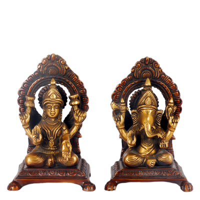 Lord Ganesha the god of New Beginnings and Mata Lakshmi the goddess of wealth. Sitting on engraved thrones with Prabhavali. Suitable for your temples